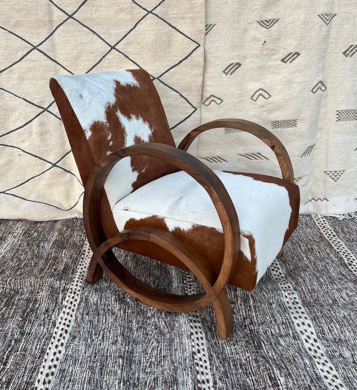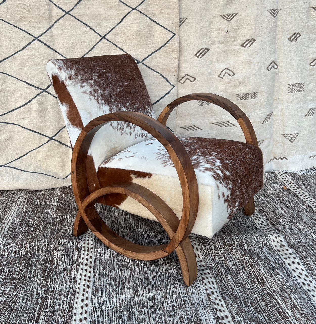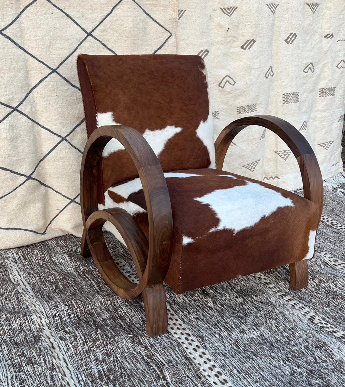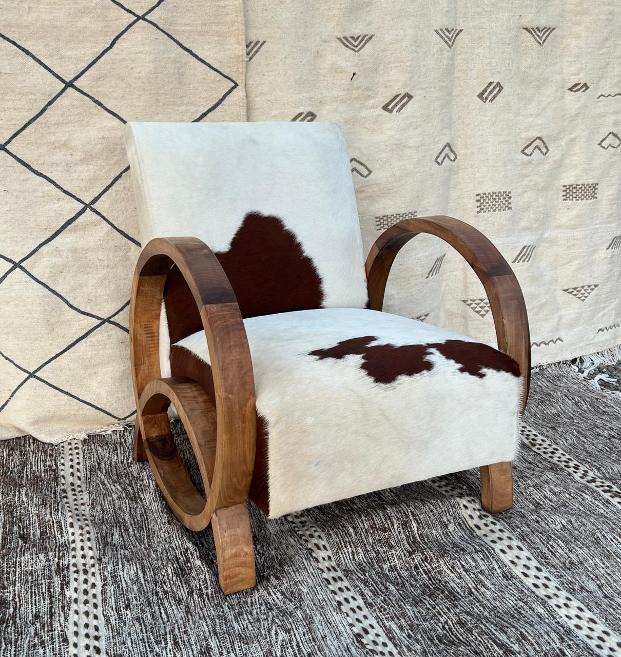 Handmade Cowhide Armchair – Walnut Wood, Moroccan Boho Lounge Chair