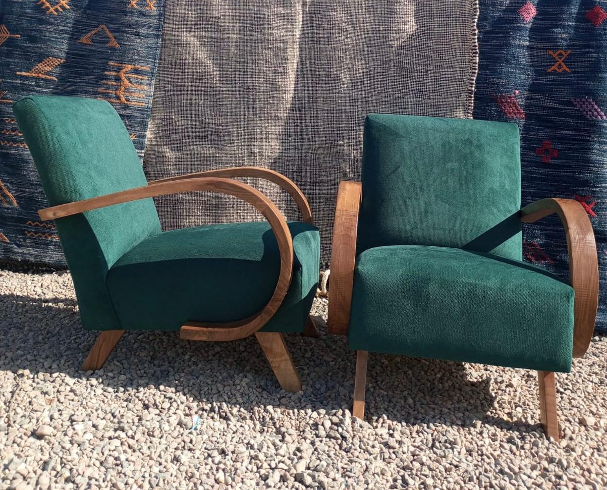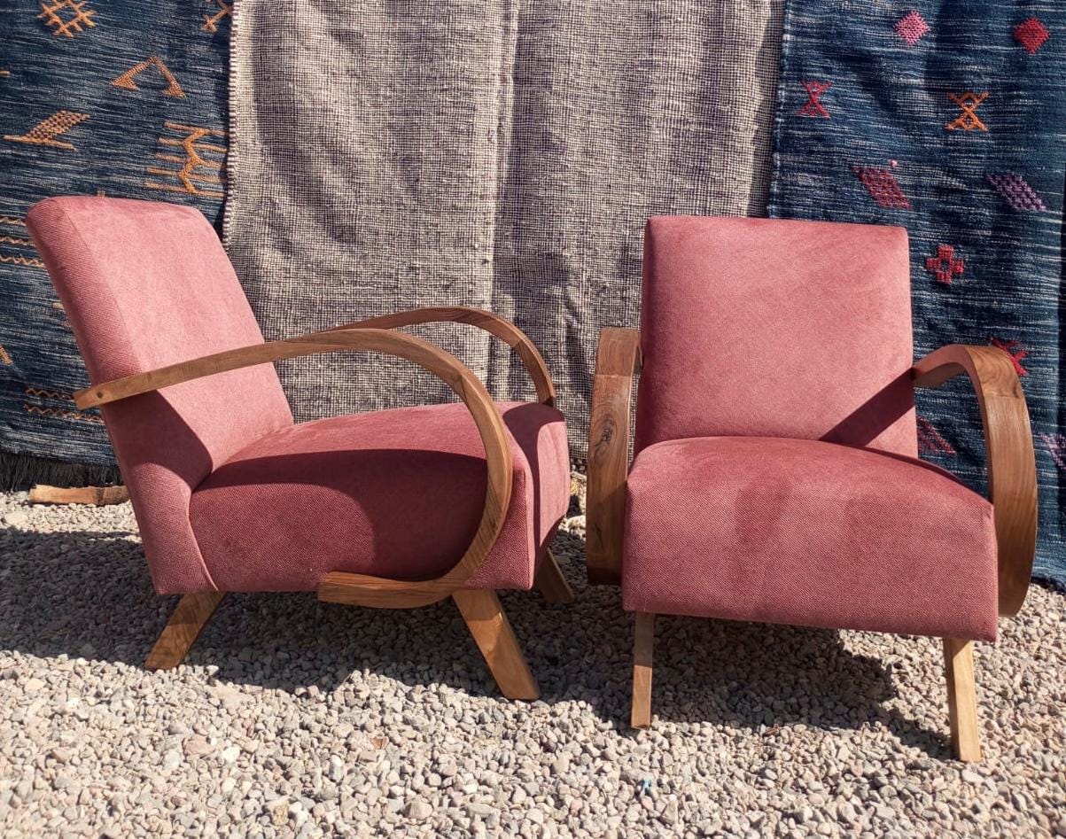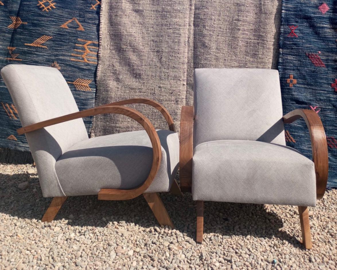 Handmade Moroccan Cowhide & Walnut Armchairs – Mid-Century Modern Pair X2