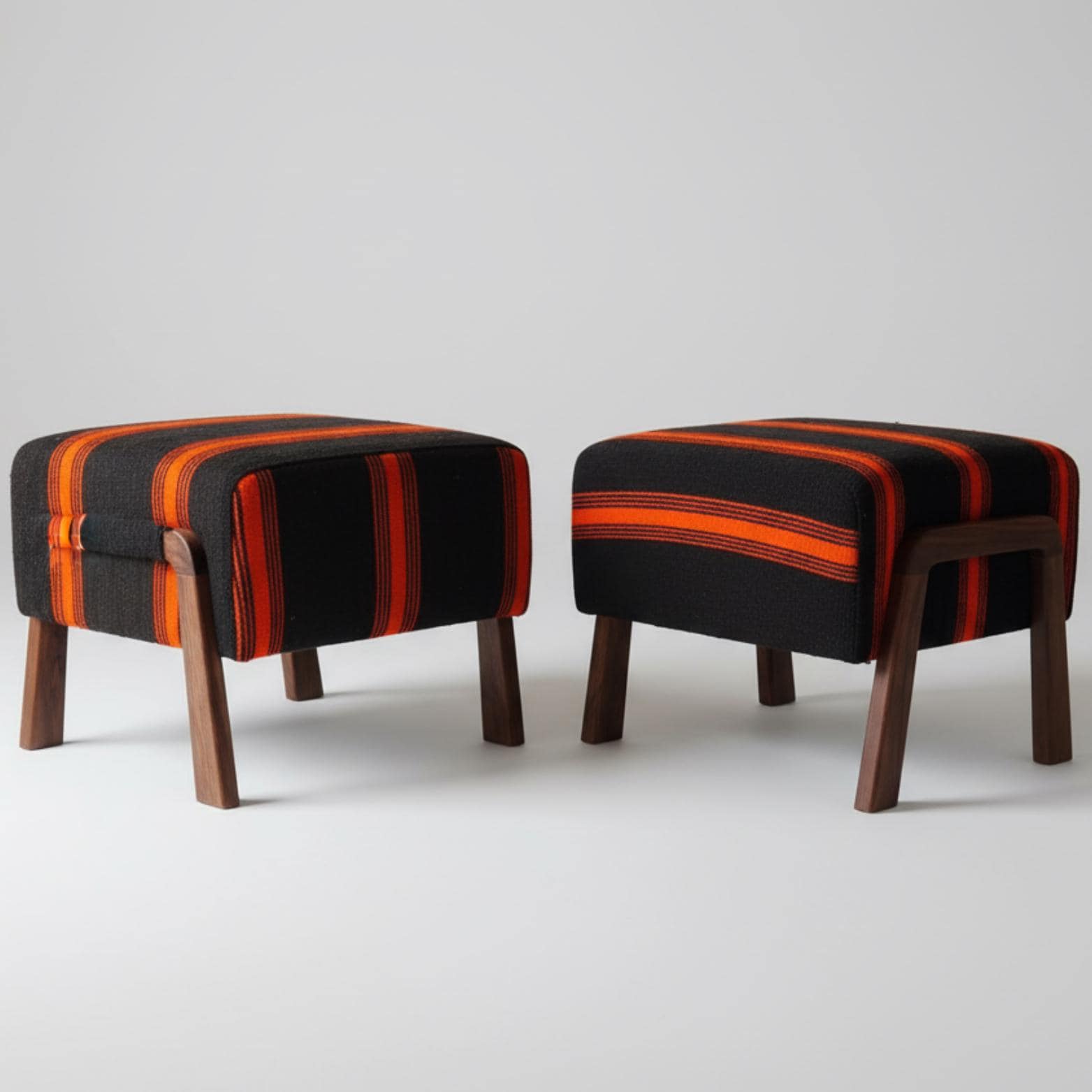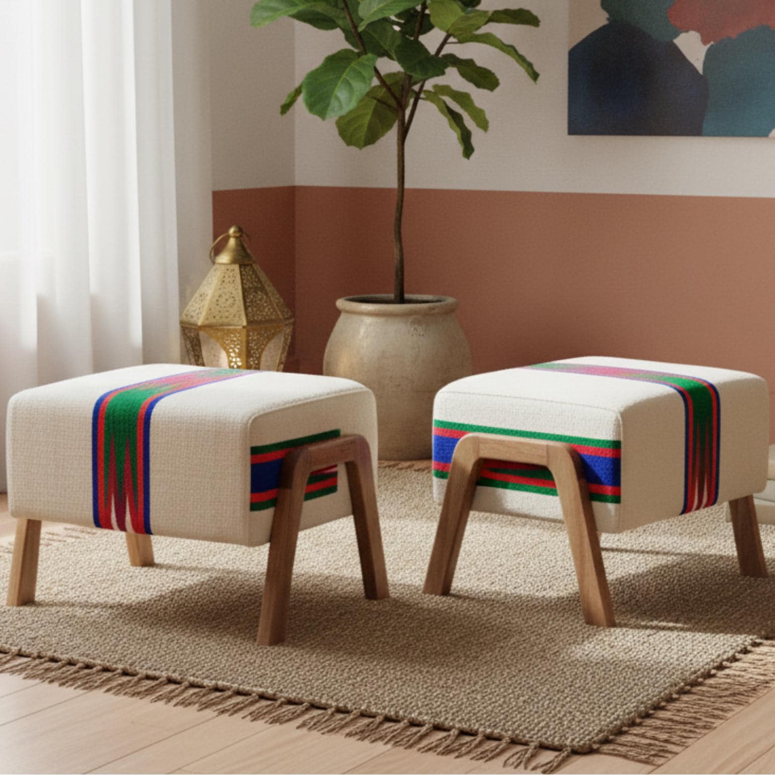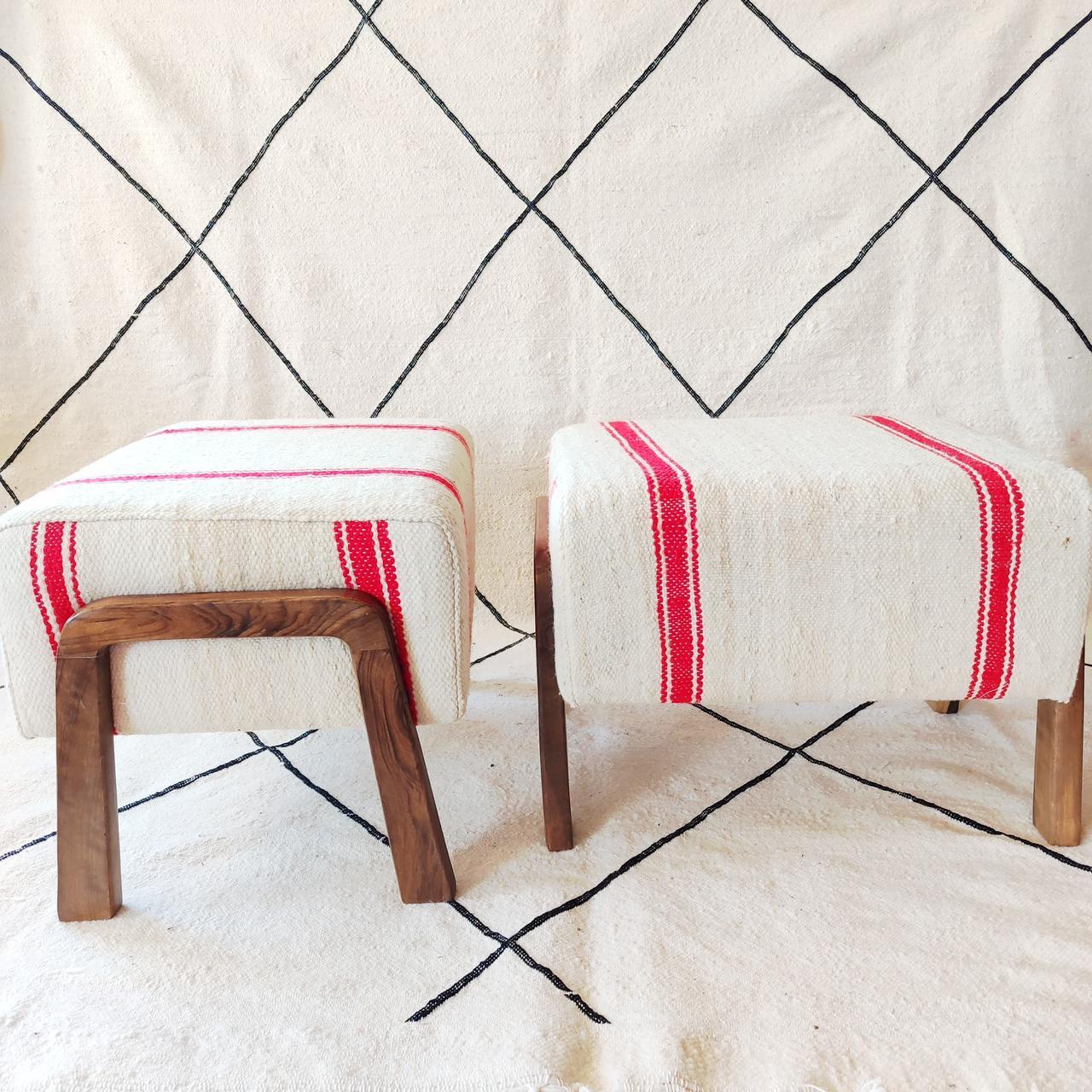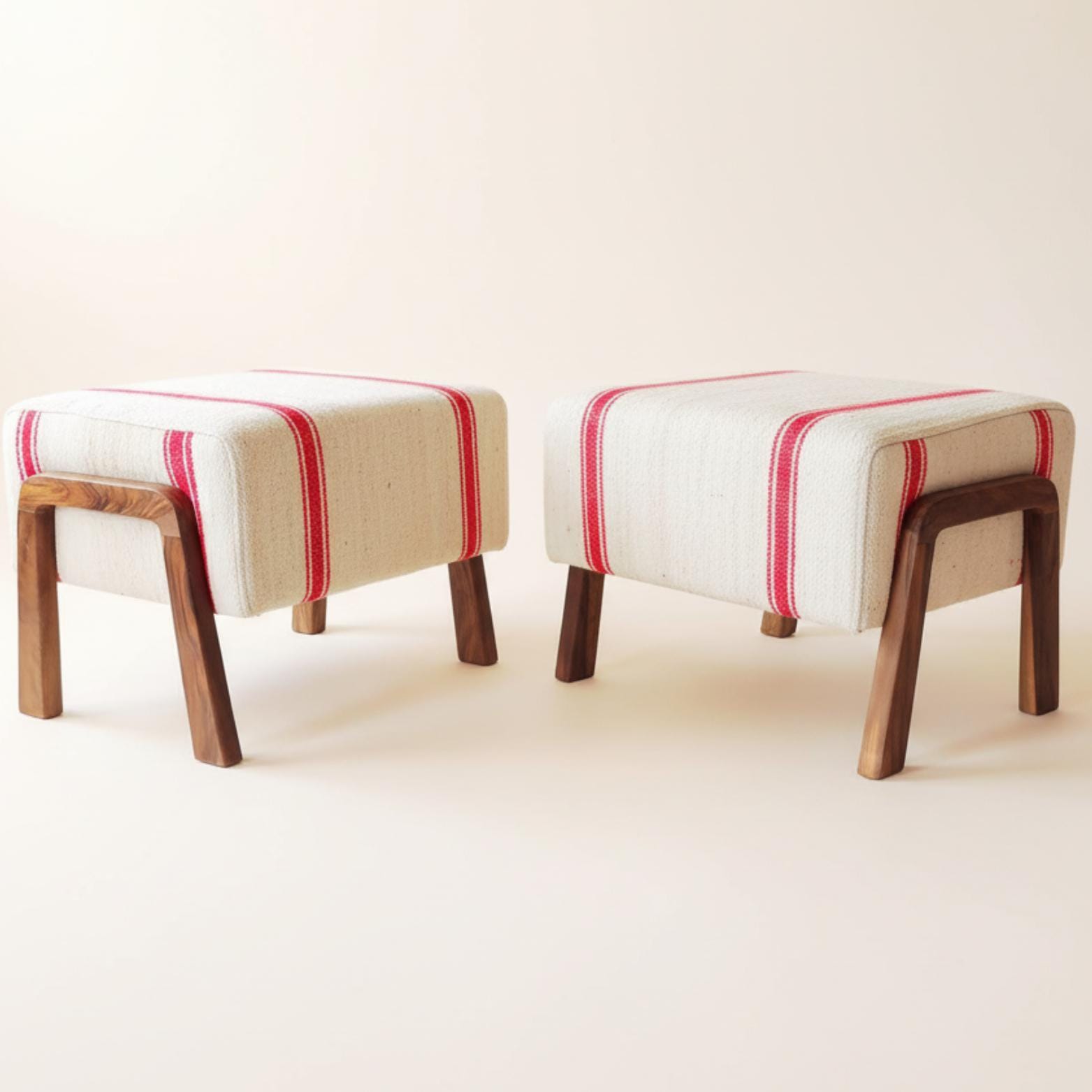 Handcrafted Red Striped Ottoman – Walnut Wood Footstool, Boho Accent
