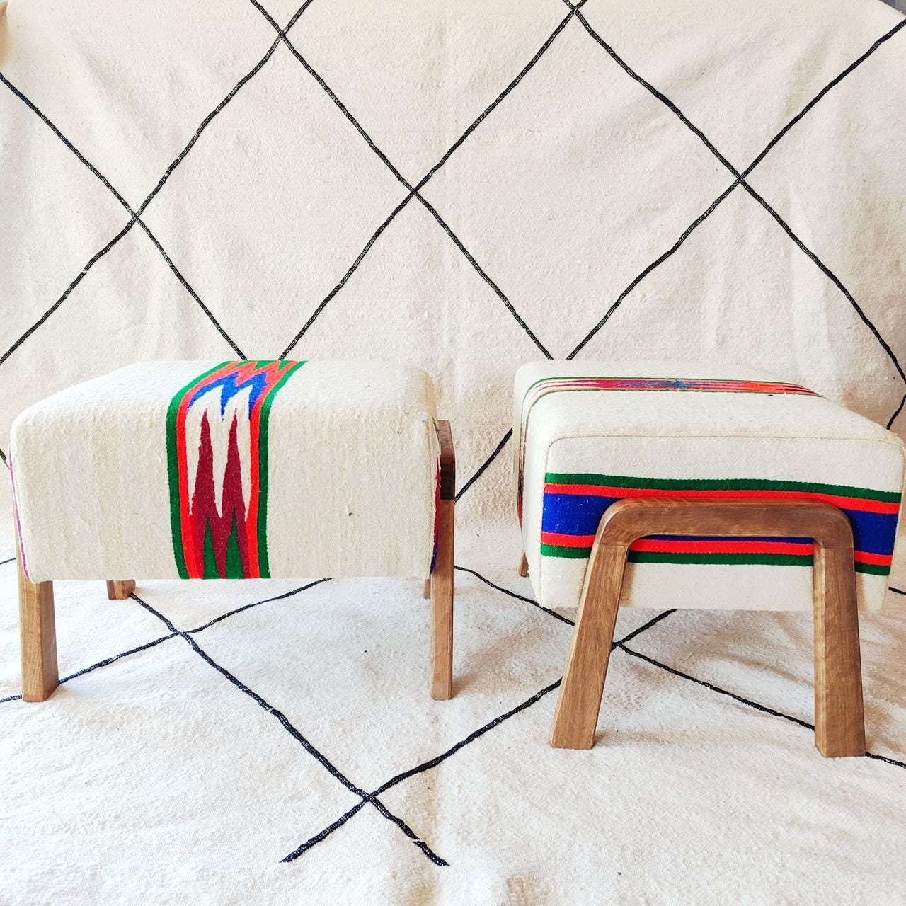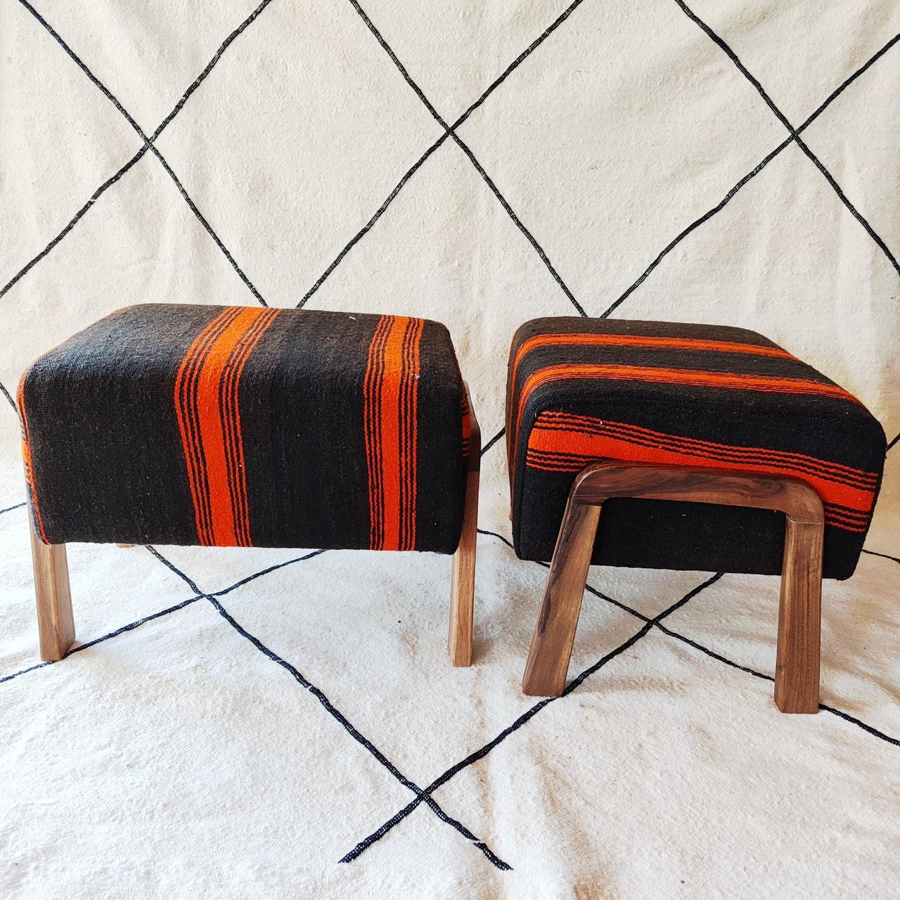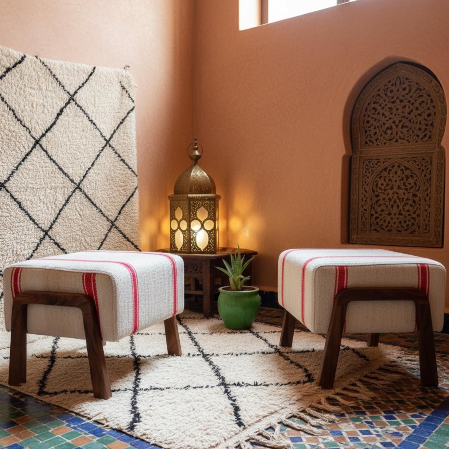 Handcrafted Red Striped Ottoman – Walnut Wood Footstool, Boho Accent