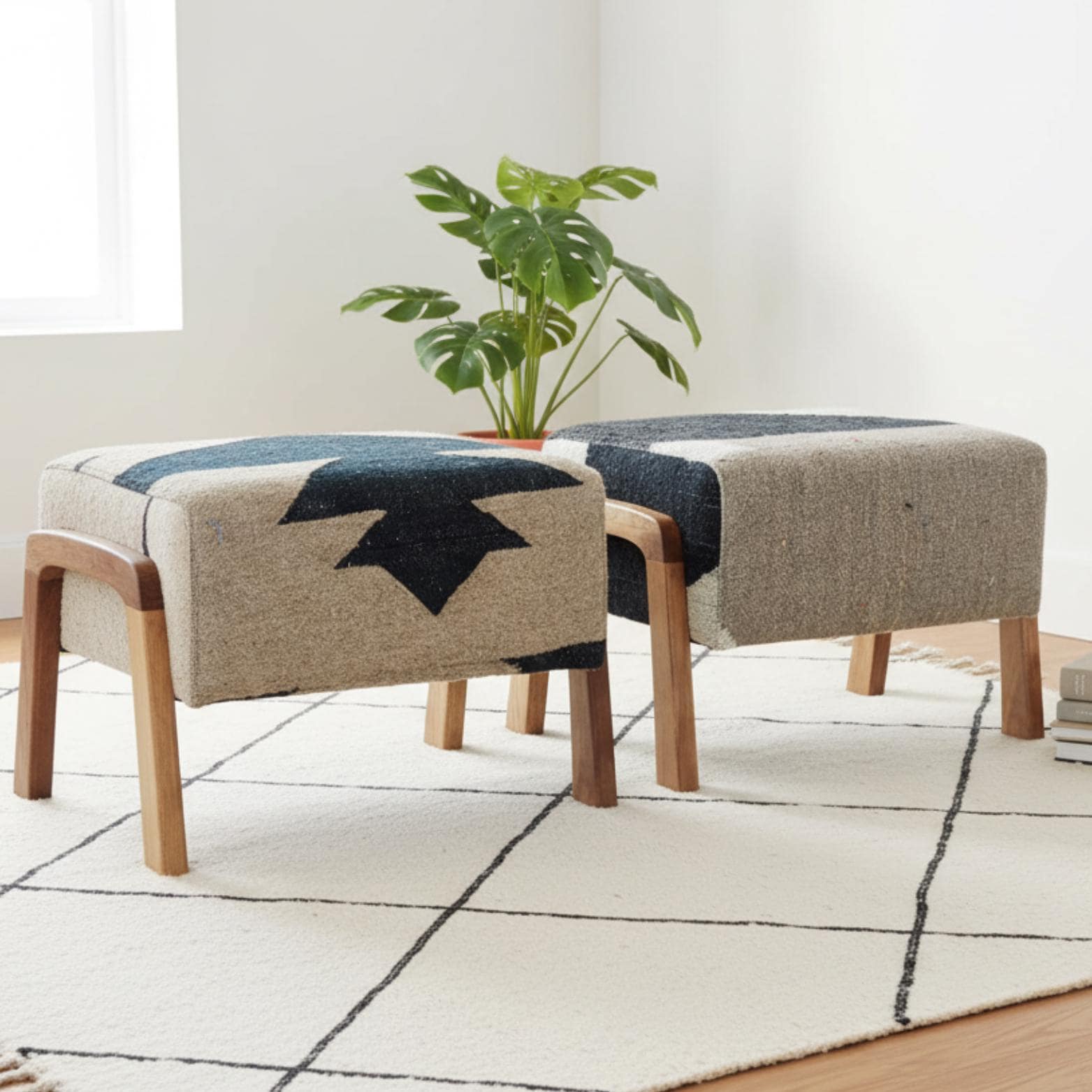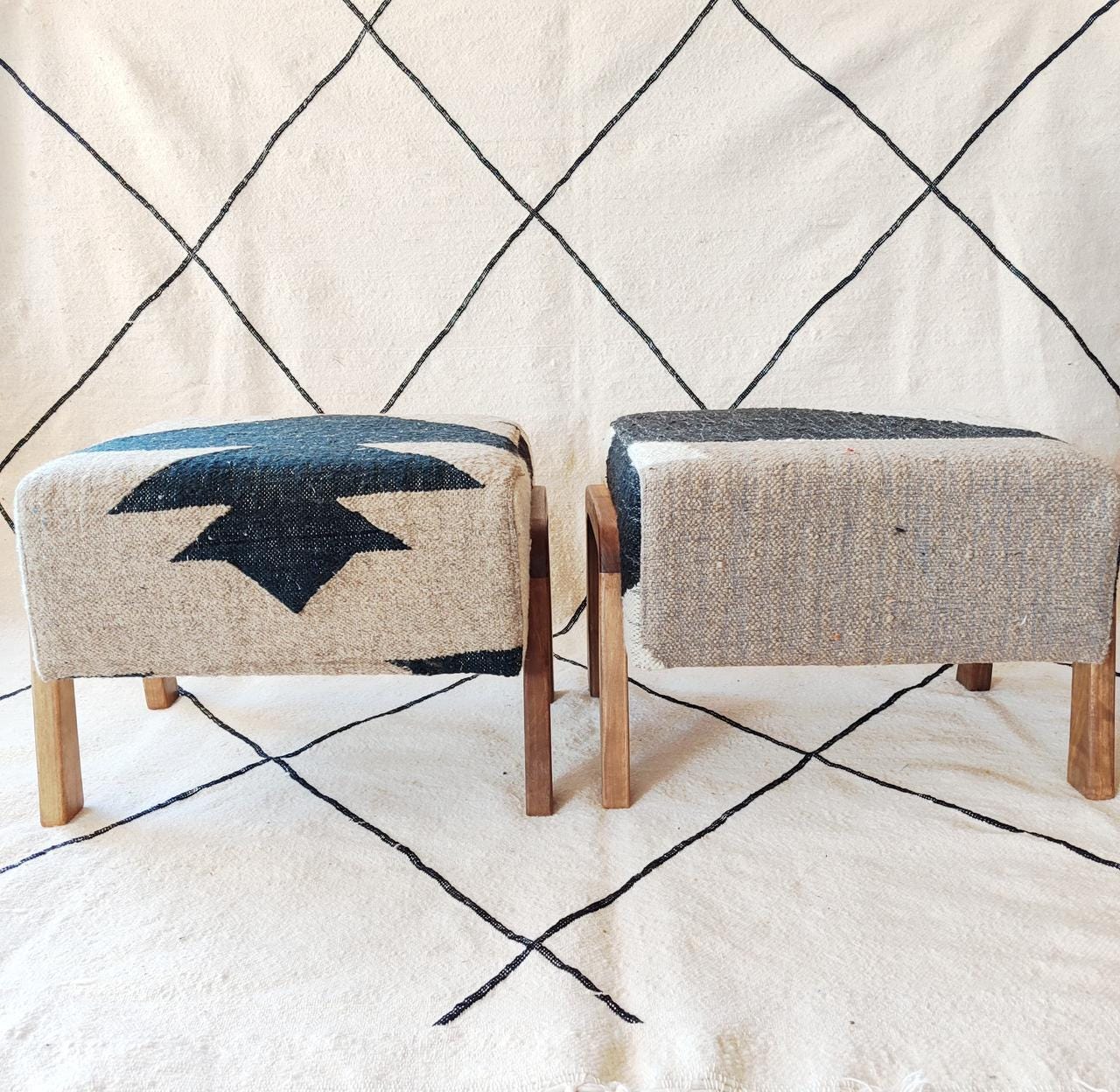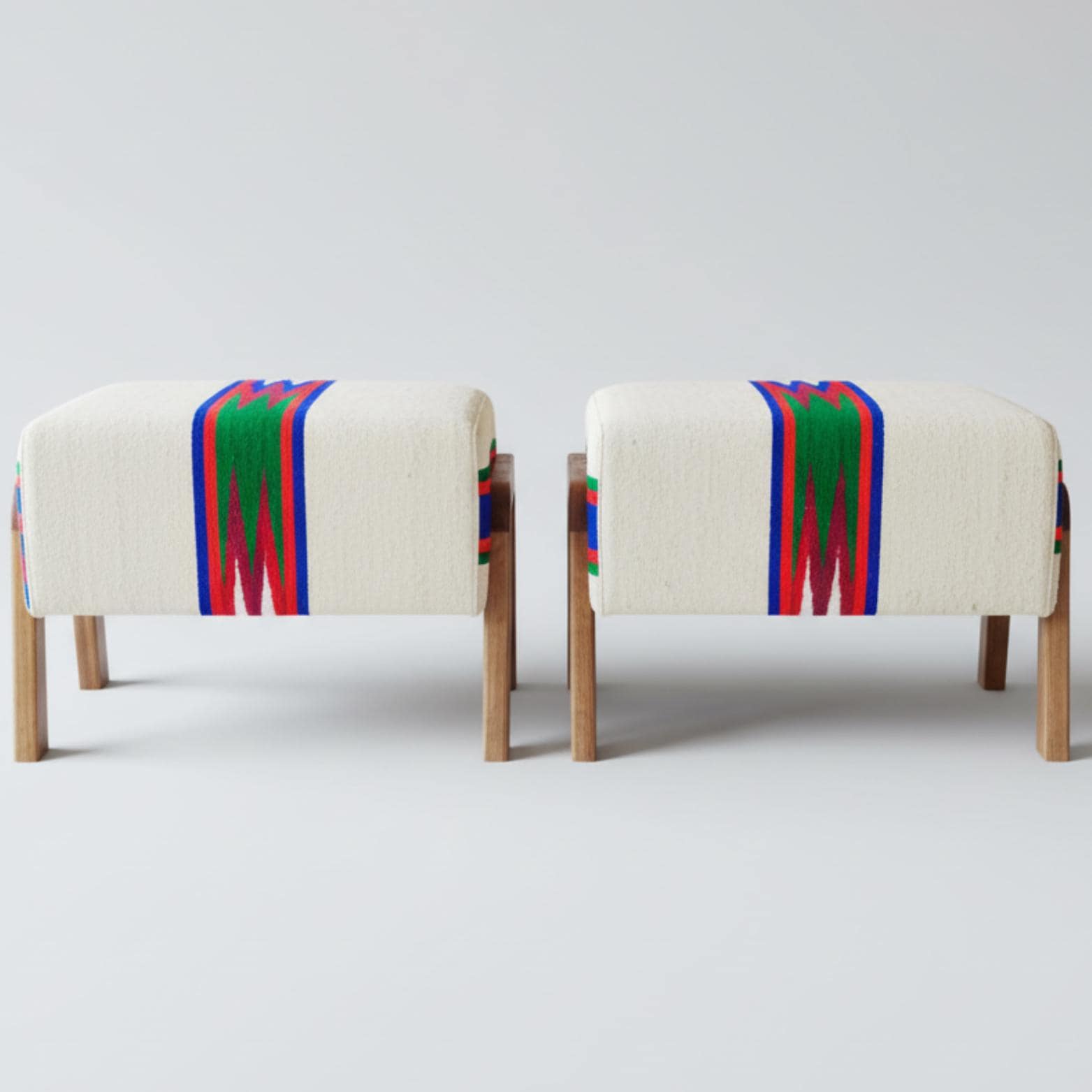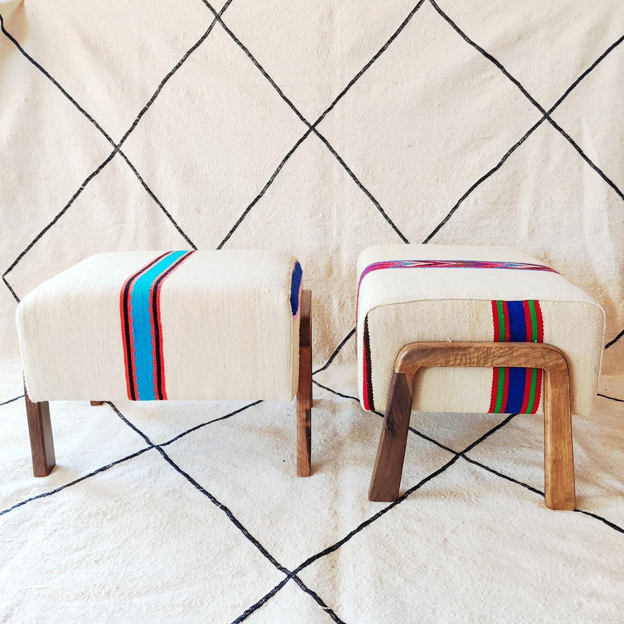 Handcrafted Red Striped Ottoman – Walnut Wood Footstool, Boho Accent