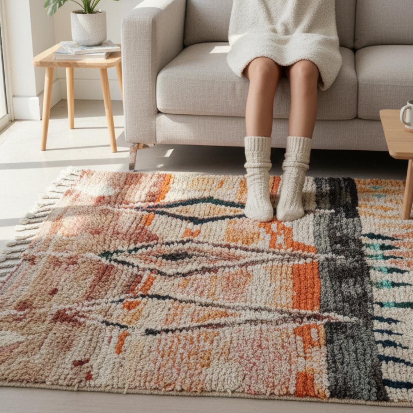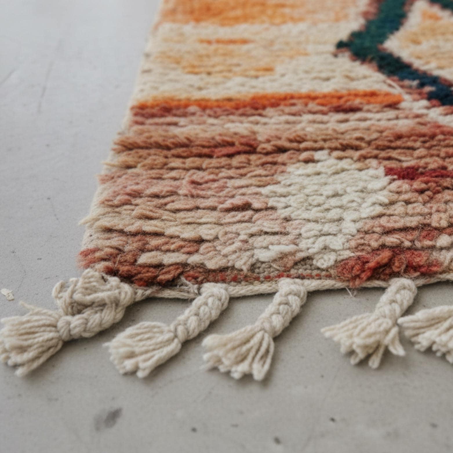 After spinning, the wool yarn is dyed using natural or chemical dyes, depending on the desired color palette. Natural dyes come from local plants, minerals, and sometimes insects, offering a range of earthy and vibrant colors. This step is crucial for achieving the rich, varied hues that Boujad rugs are known for.