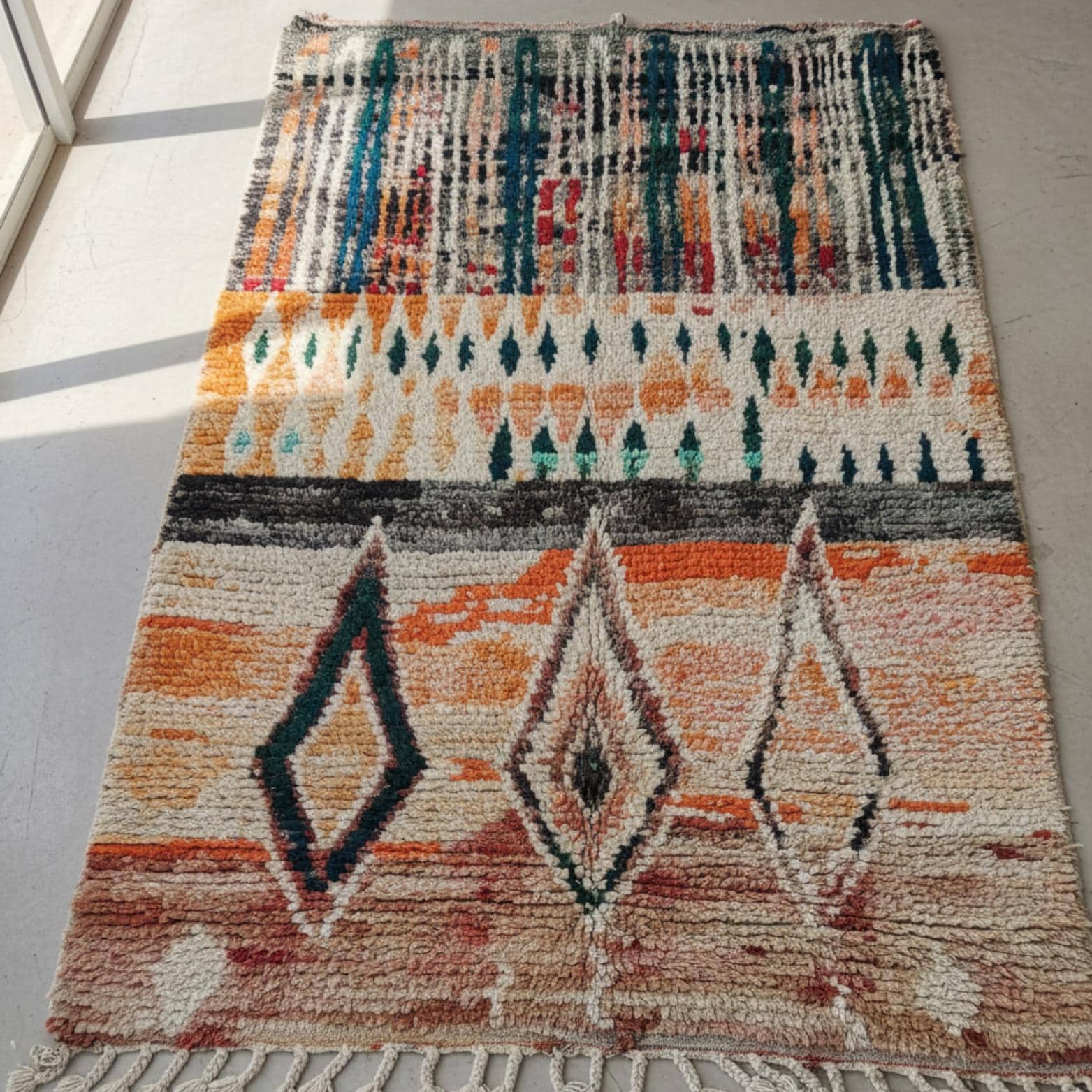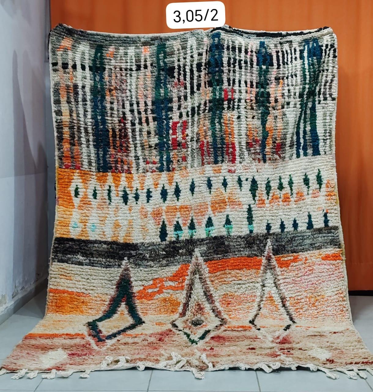 Made primarily from wool, these rugs are not only beautiful but also durable, capable of withstanding the test of time. Each piece is unique, reflecting the artisan's individual creativity and the traditional techniques passed down through generations. The Boujad rug is a vibrant testament to the rich culture and artistic heritage of the Moroccan Berber community, adding warmth, color, and story to any space it occupies.