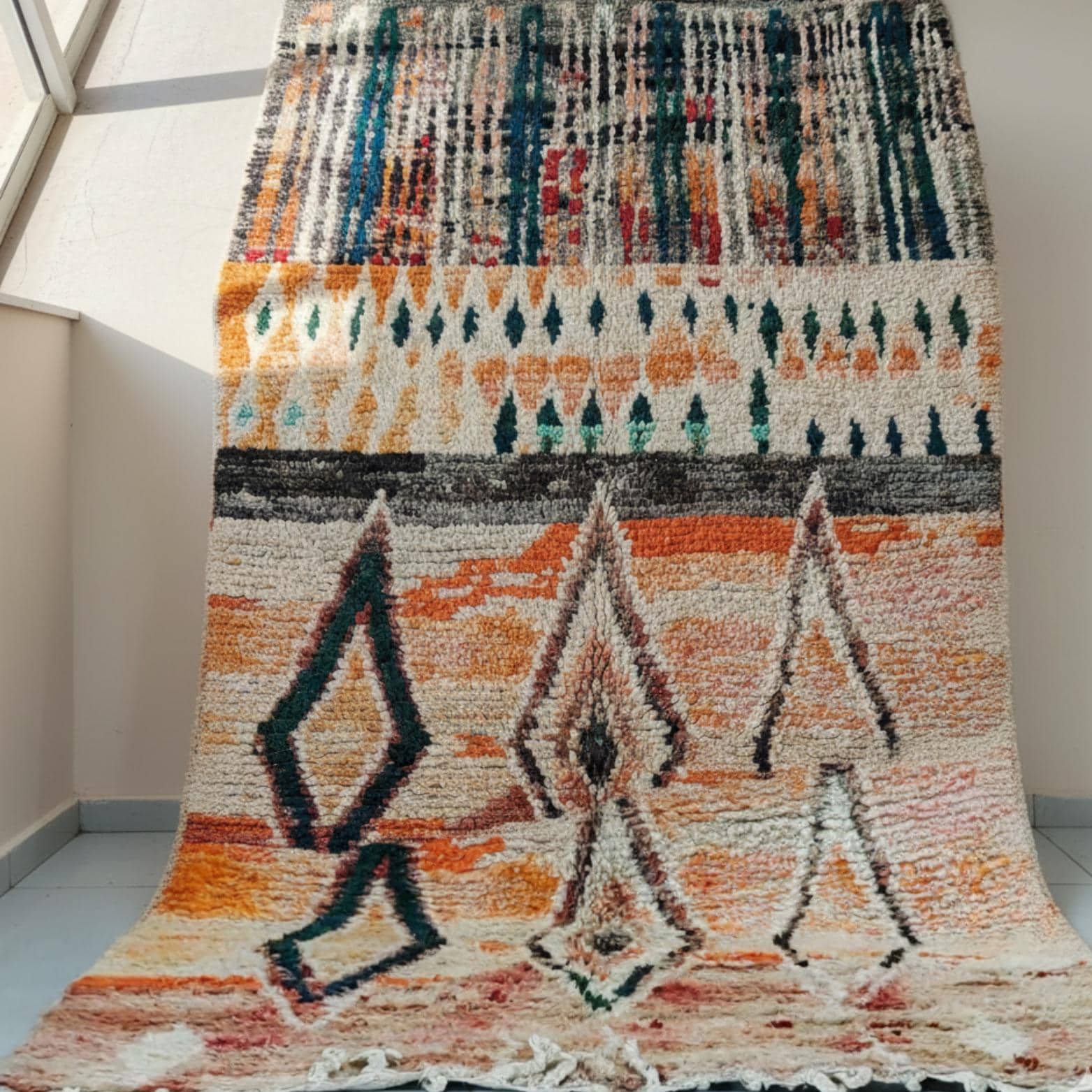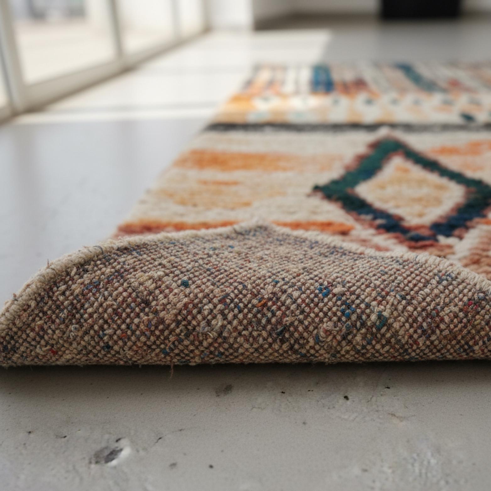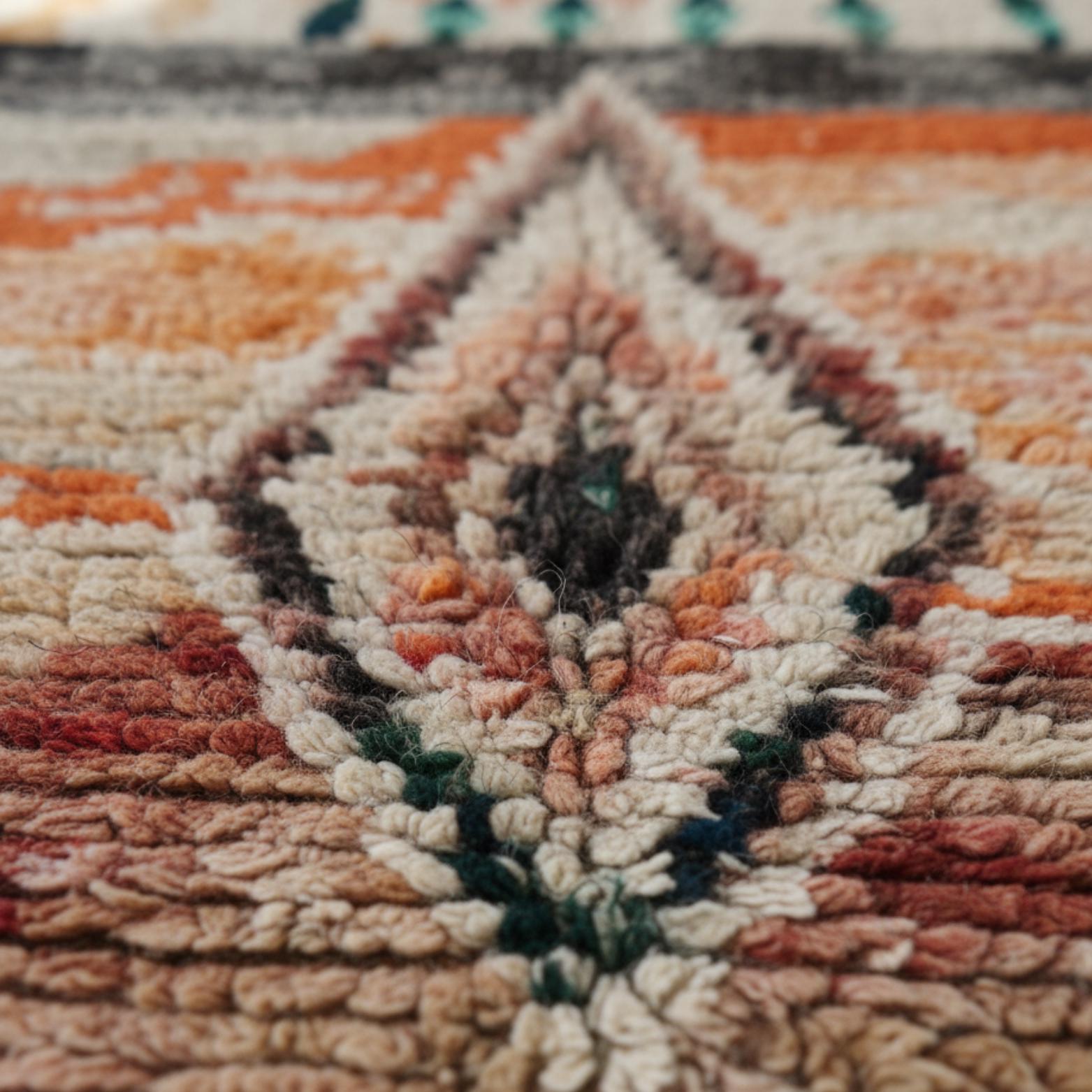 THIS Boujad rug is a type of Moroccan rug, handwoven by the Berber tribes in and around the town of Boujad in the Haouz region of Morocco. These distinctive rugs are known for their bold colors—primarily hues of pinks, reds, oranges, and purples—as well as their unique abstract patterns. Unlike their more geometric cousins from the Atlas Mountains, Boujad rugs often feature less structured designs, incorporating a mix of tribal symbols and motifs that tell stories or represent the weaver's personal experiences and emotions.