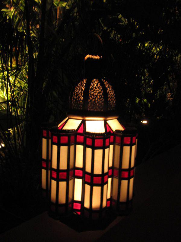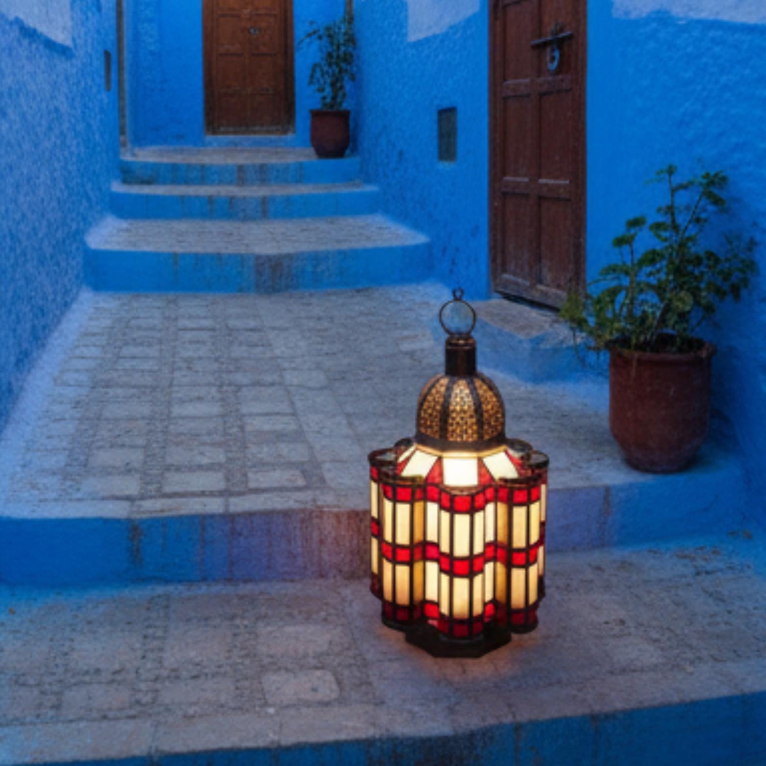 Illuminate your space with the warm glow of Moroccan craftsmanship. This handcrafted hanging lantern features richly colored red and white stained‑glass panels set in a metal frame topped with an ornate Moroccan‑style dome. Each light casts intricate shadows and reflections, creating an exotic ambiance perfect for living rooms, patios, or cozy corners.