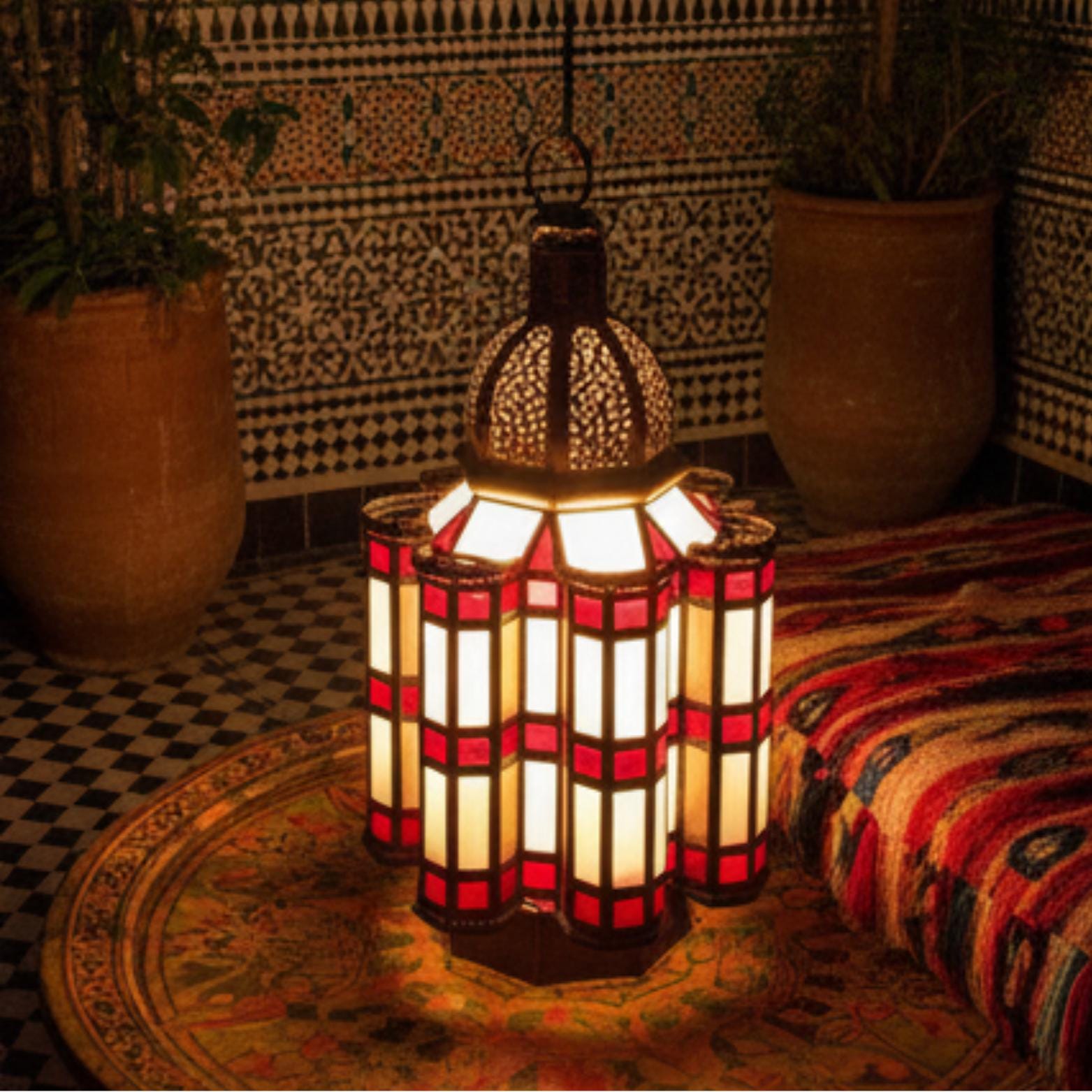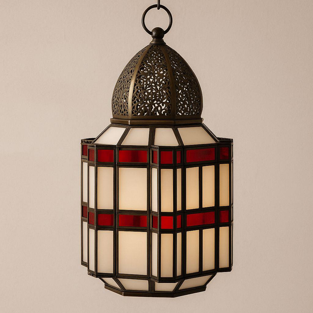 Handcrafted Moroccan Stained Glass Lantern – Marrakech Hanging Lamp with Red & White Panels