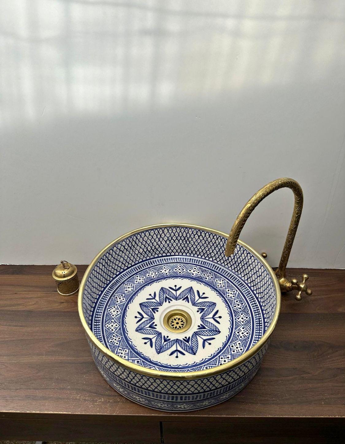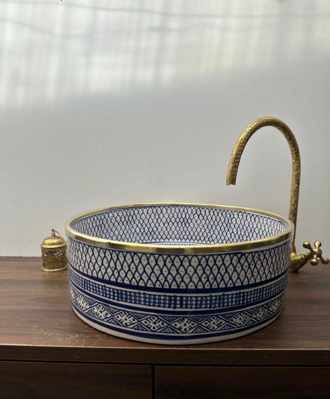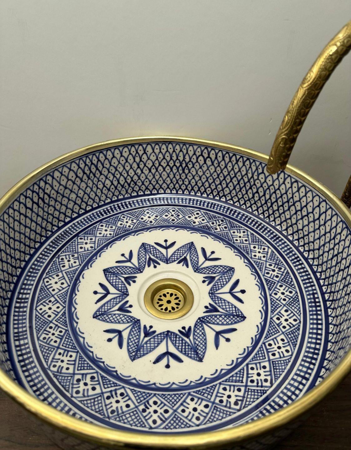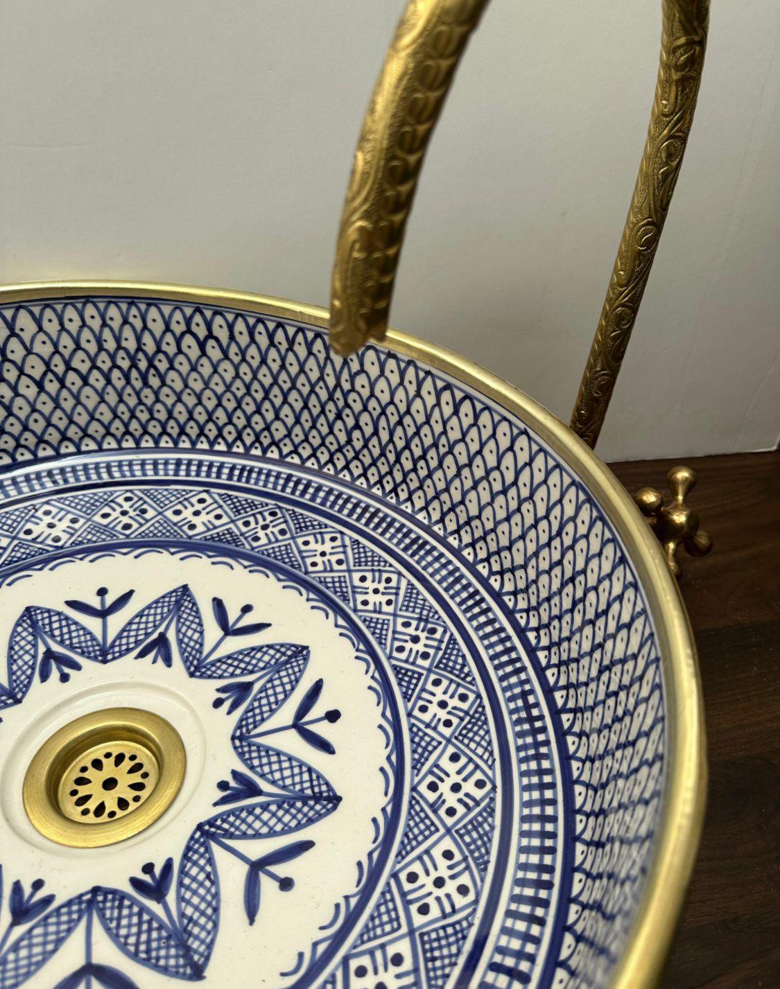 Handcrafted Moroccan Ceramic Sink with Brass Faucet – Blue & White Traditional Bathroom Basin 40 cm