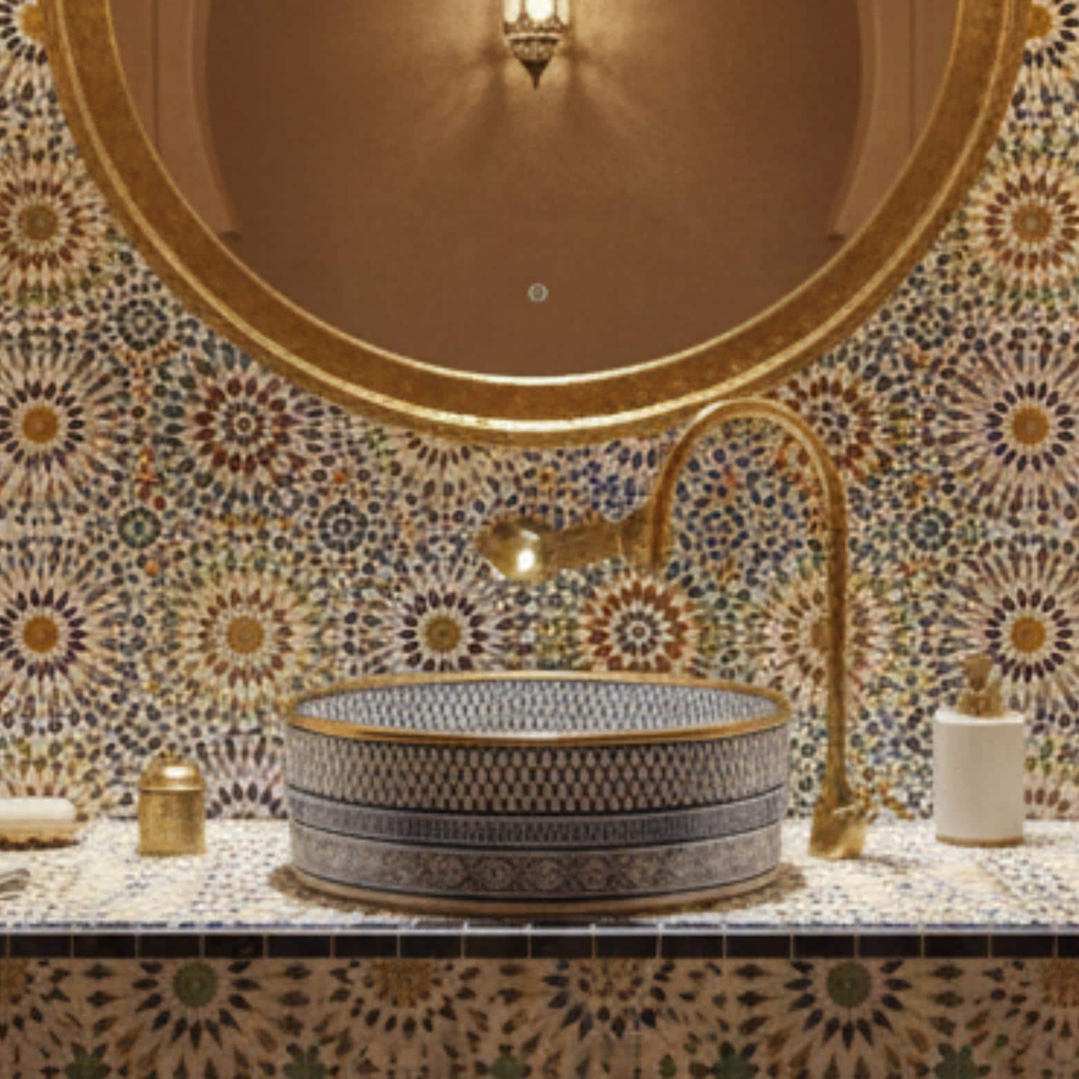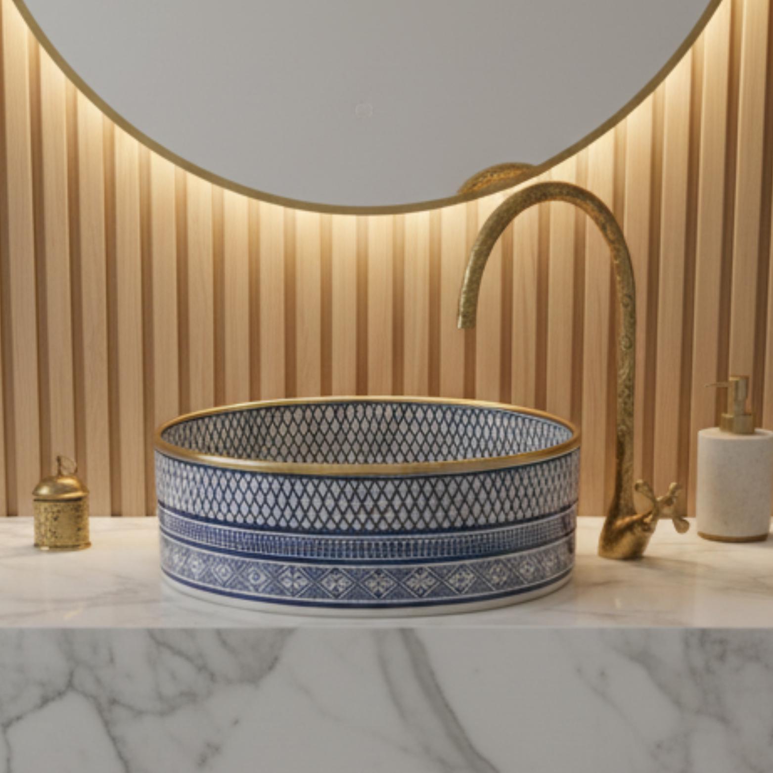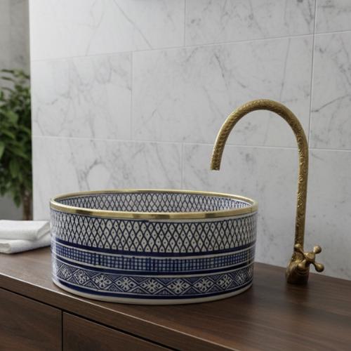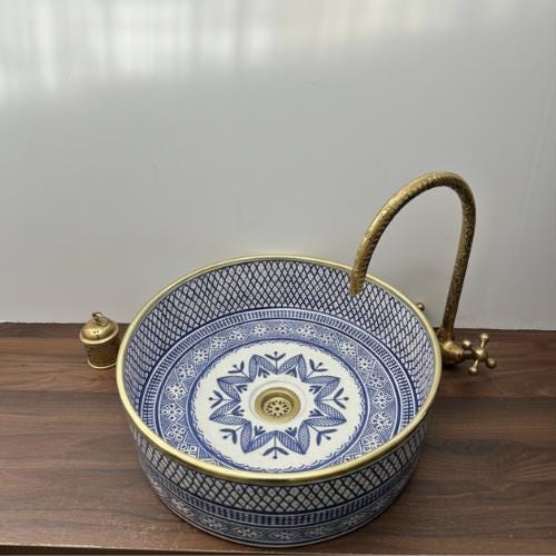 Bring a touch of Moroccan elegance to your bathroom with this stunning handcrafted ceramic sink. Featuring intricate blue and white patterns, this basin is paired with a vintage-style brass faucet for a perfect blend of artistry and functionality. Each piece is carefully made by skilled artisans, ensuring unique quality and timeless beauty.