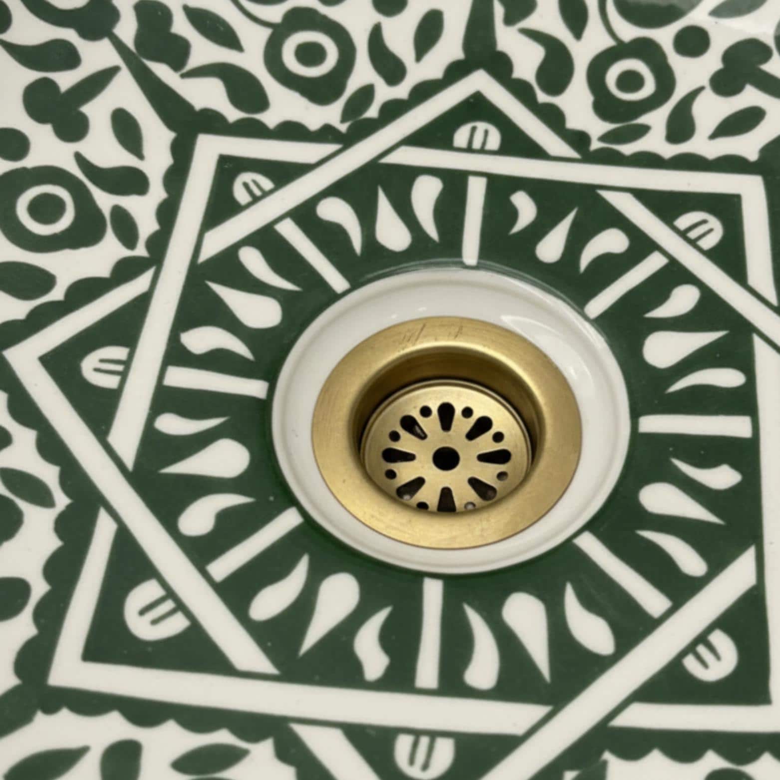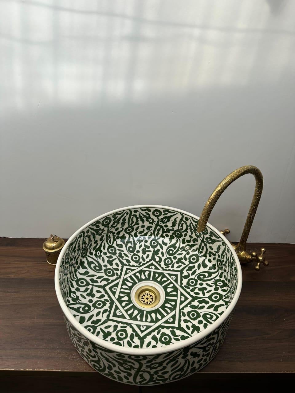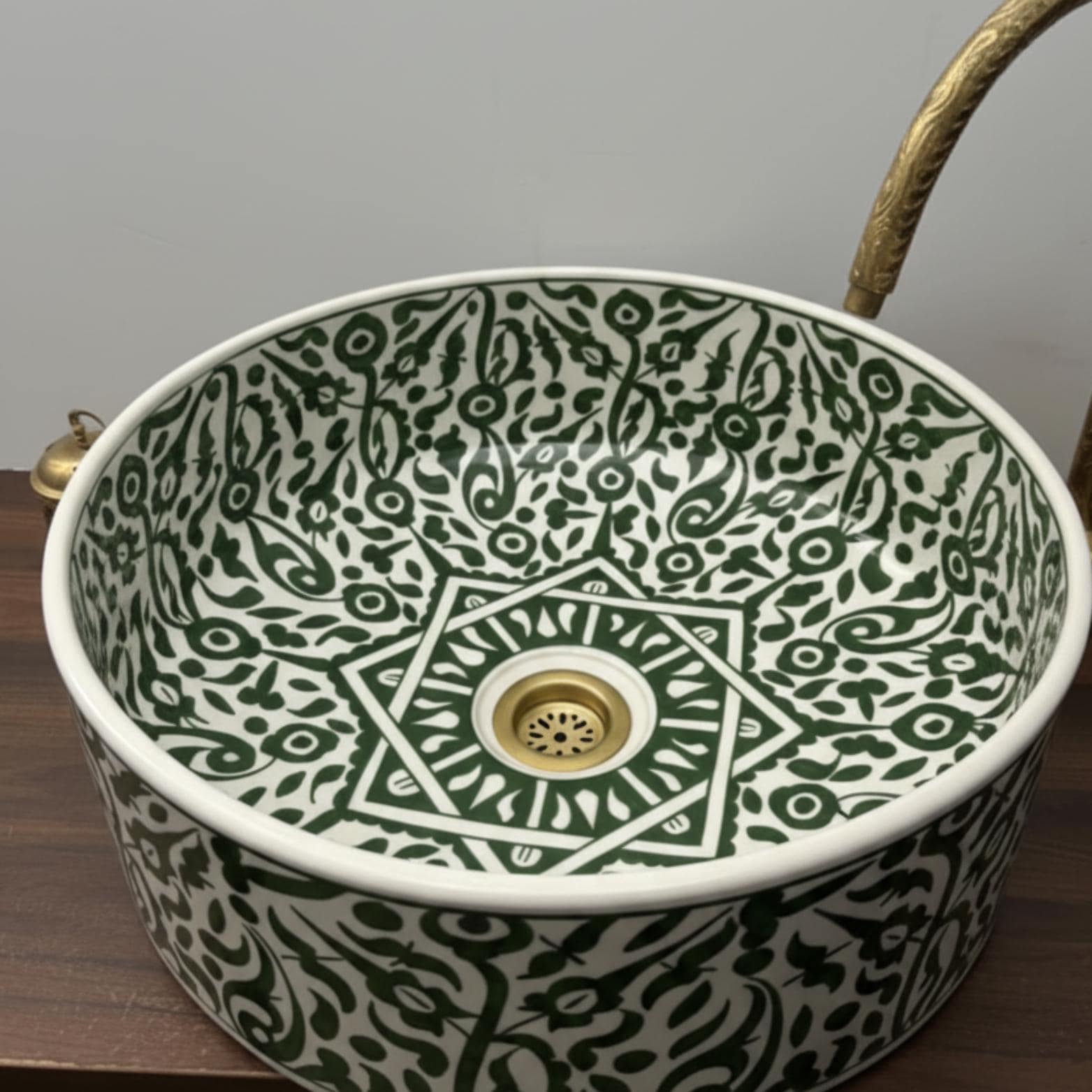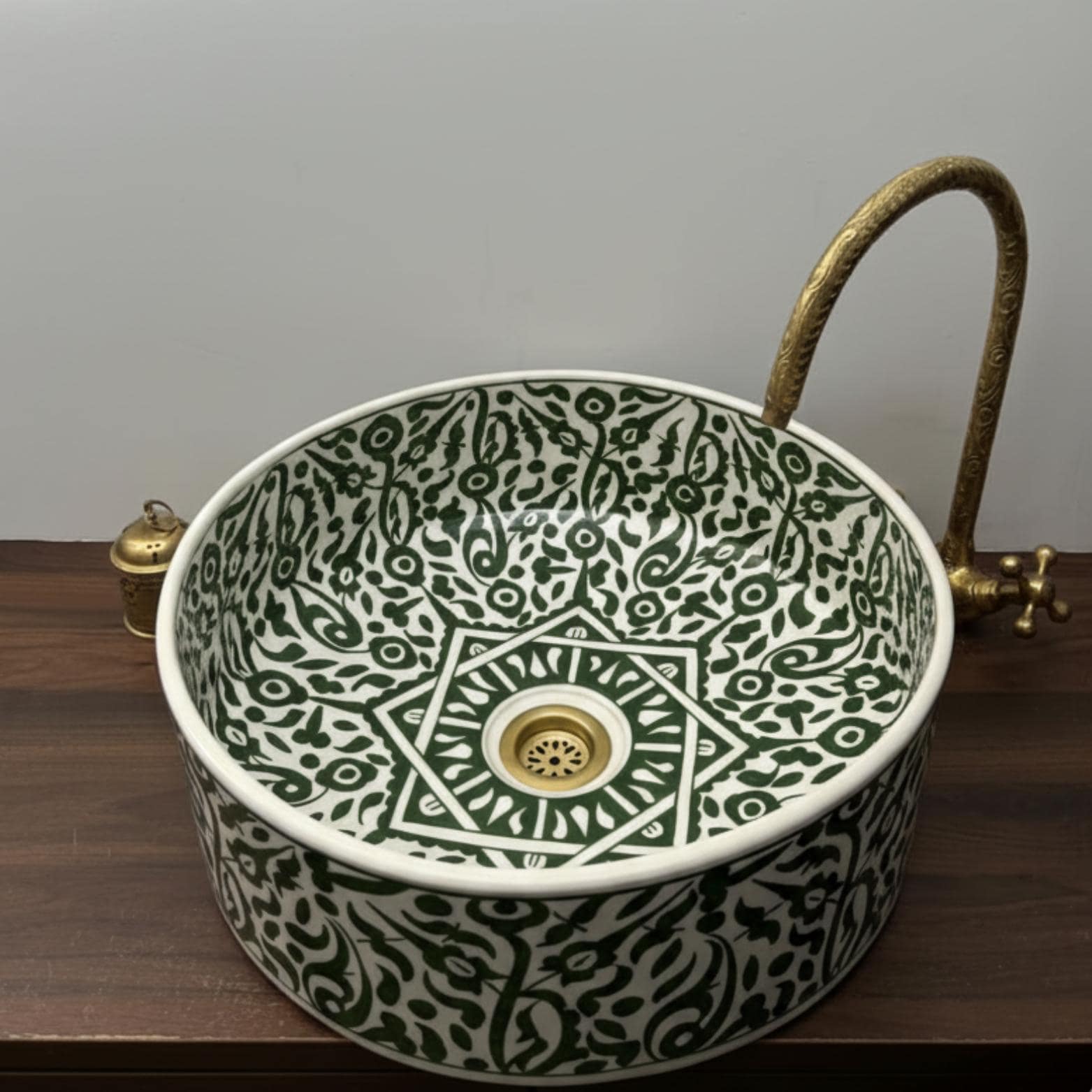 Handcrafted Moroccan Ceramic Sink with Brass Faucet – green & White Traditional Bathroom Basin 35 Cm