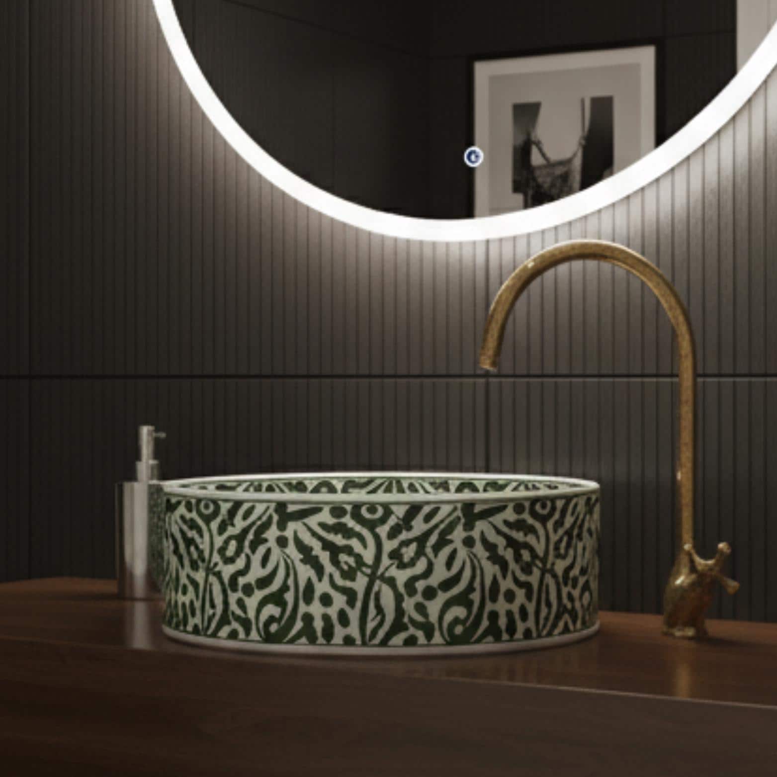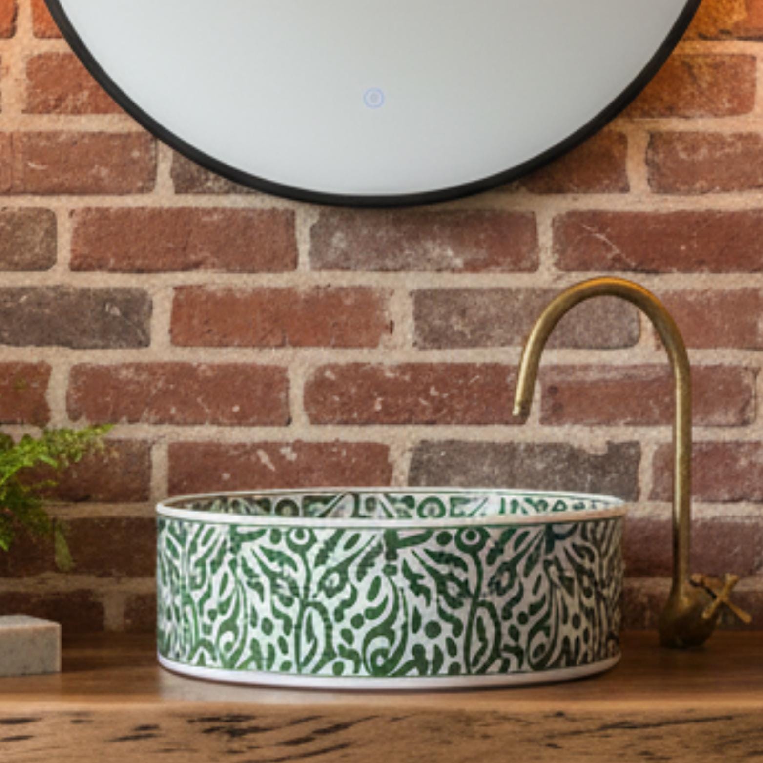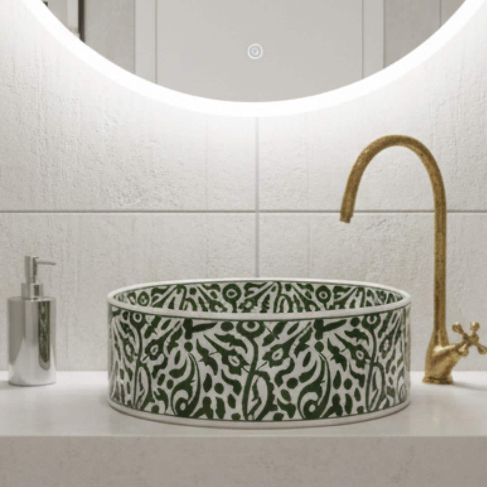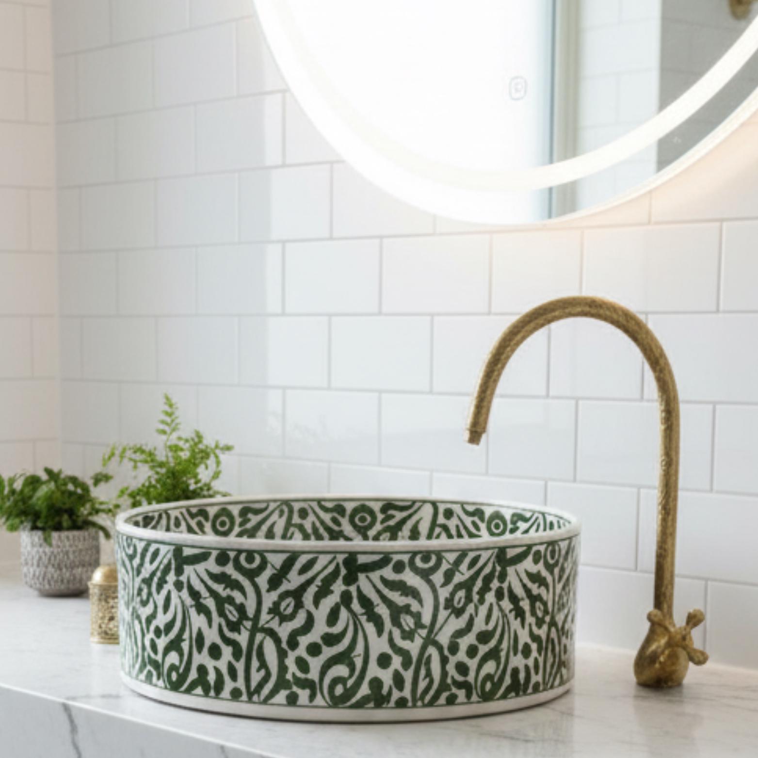 Handcrafted Moroccan Ceramic Sink with Brass Faucet – green & White Traditional Bathroom Basin 35 Cm