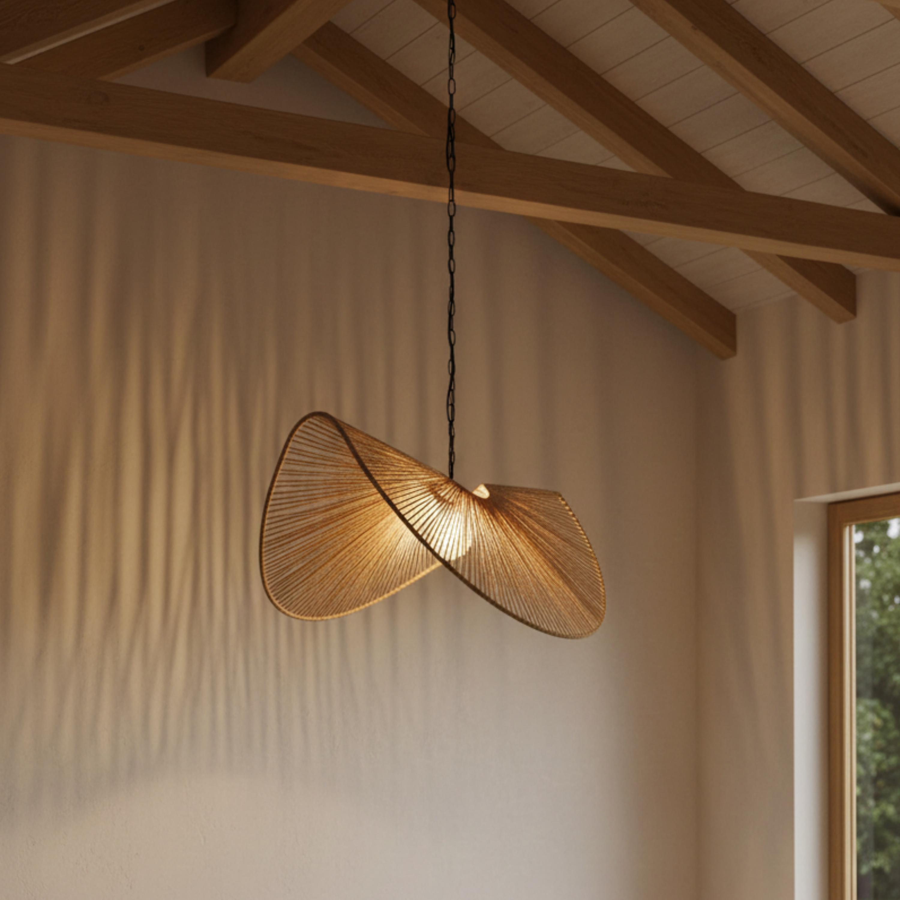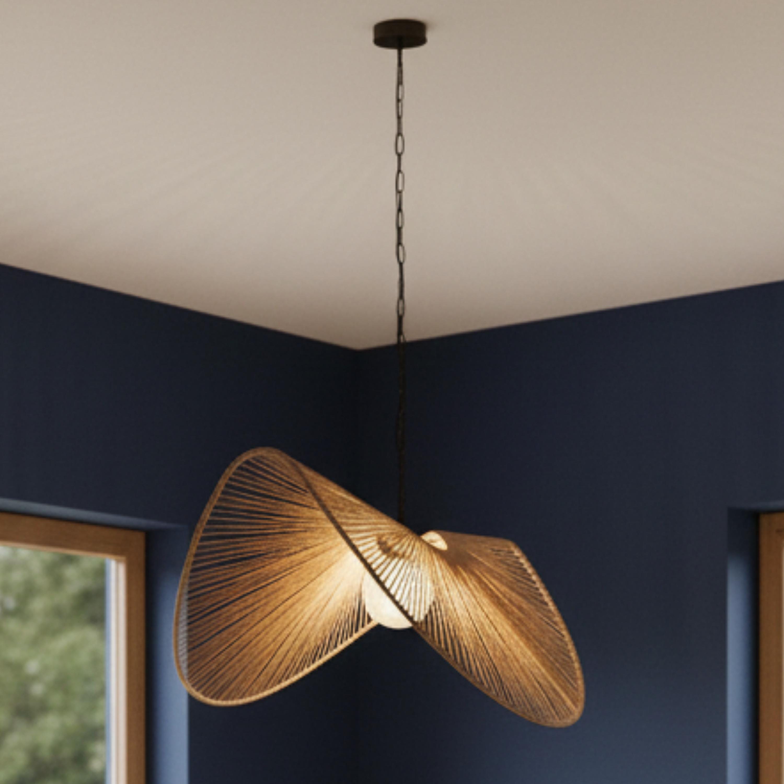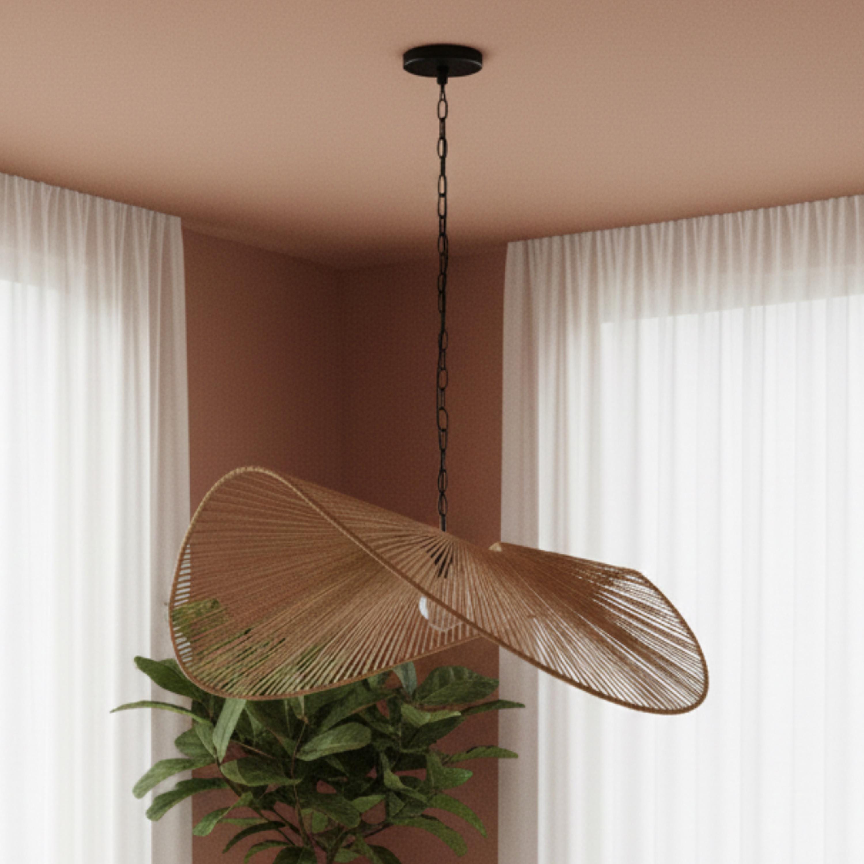 Elevate your space with this stunning handcrafted twisted rope pendant light, inspired by organic forms and traditional Moroccan artistry. Its sculptural, fan-like design casts beautiful shadows and adds an artistic touch to any room. Expertly handwoven with natural rope over a sturdy metal frame, this piece blends modern aesthetics with artisanal craftsmanship. Perfect for living rooms, dining spaces, or creative interiors that call for unique lighting.